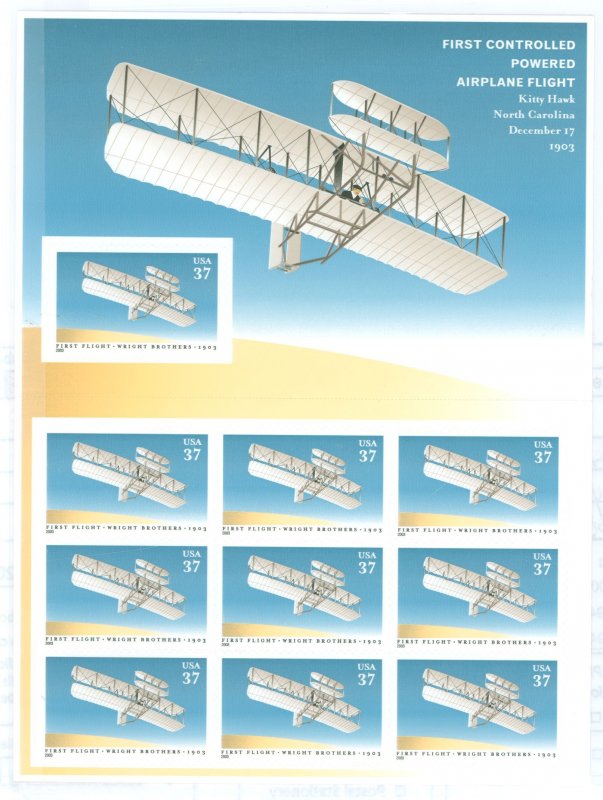 2003 wright Brothers first flight centennial, plane, complete s/a pane of 10APS Stamp Id: 501777502