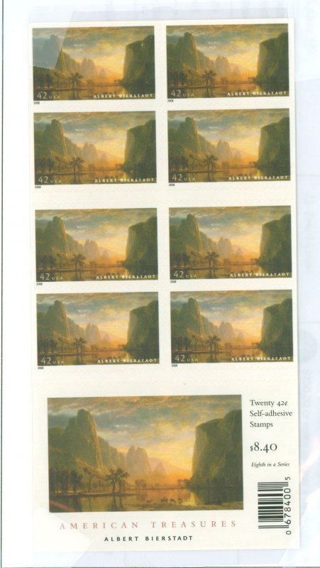 2008 Valley of the Yosemite by Bierstadt; SDC 11 on 2 or 3 sides; BC 246. Booklet pane of twenty 42c stamps, plate #S1111. APS Stamp Id: 501735221 APS Seller Id: 604098 Hinge Type: NH
