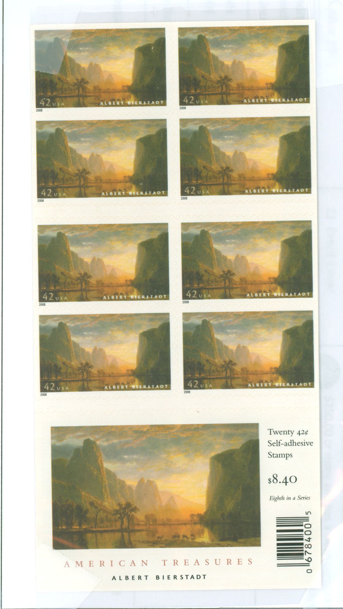 2008 Valley of the Yosemite by Bierstadt; SDC 11 on 2 or 3 sides; BC 246. Booklet pane of twenty 42c stamps, plate #S1111.APS Stamp Id: 501735221