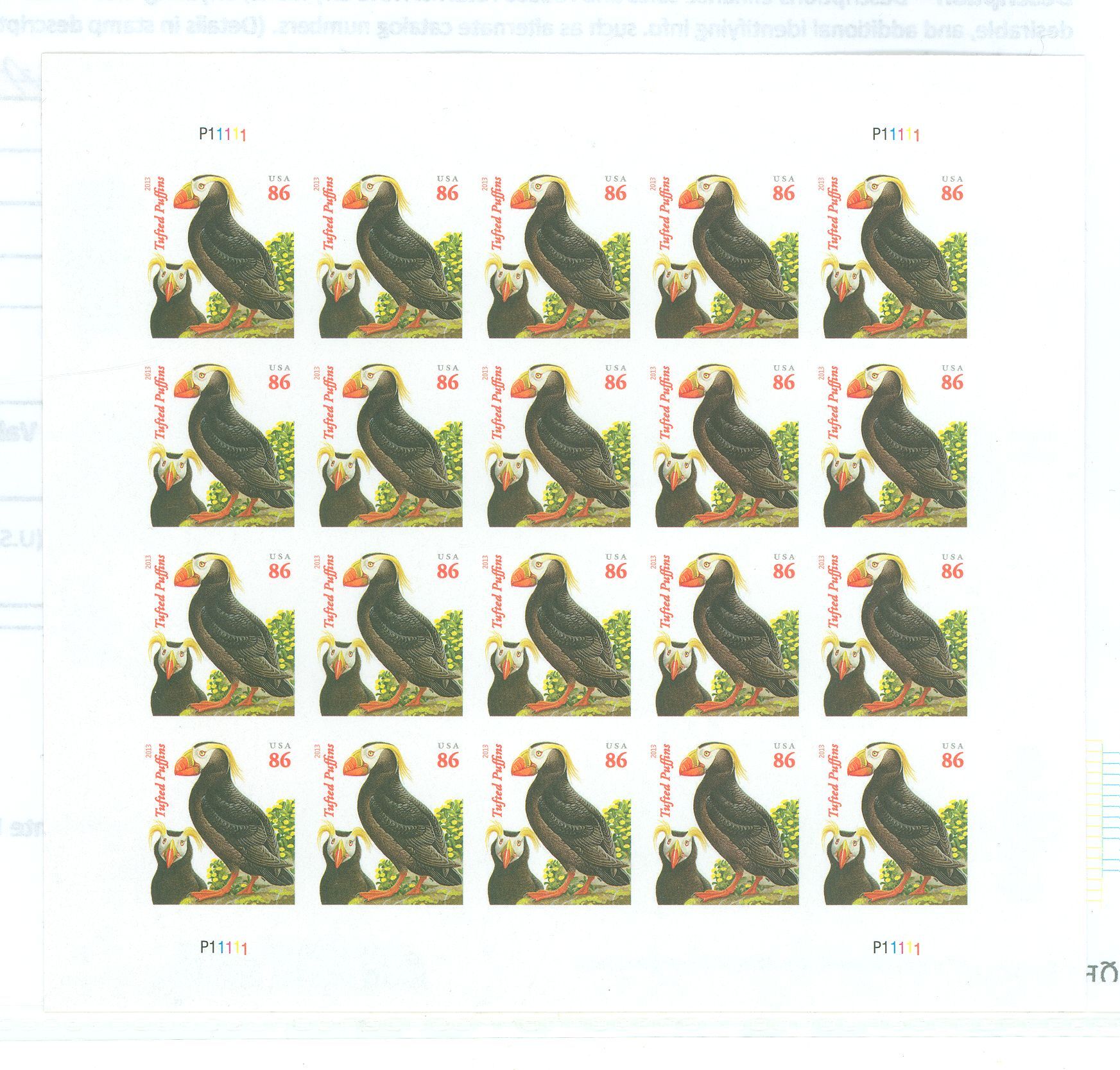 Tufted Puffins, imperforate pane of 20APS Stamp Id: 502063143