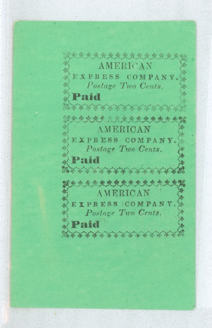 1856 Local stamps - American Express Forgery A, vertical strip of 3 with sheet margin at left and bottom APS Stamp Id: 501603691 APS Seller Id: 568446 Hinge Type: NG Other Catalog Name: Lyon's Book