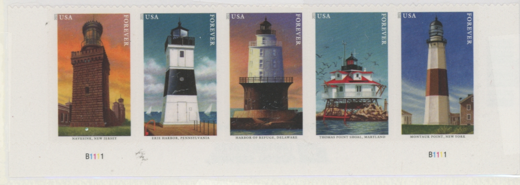 2021 Issue of Mid-Atlantic Lighthouses. Horizontal strip of 5. Plate #B1111.APS Stamp Id: 501866401