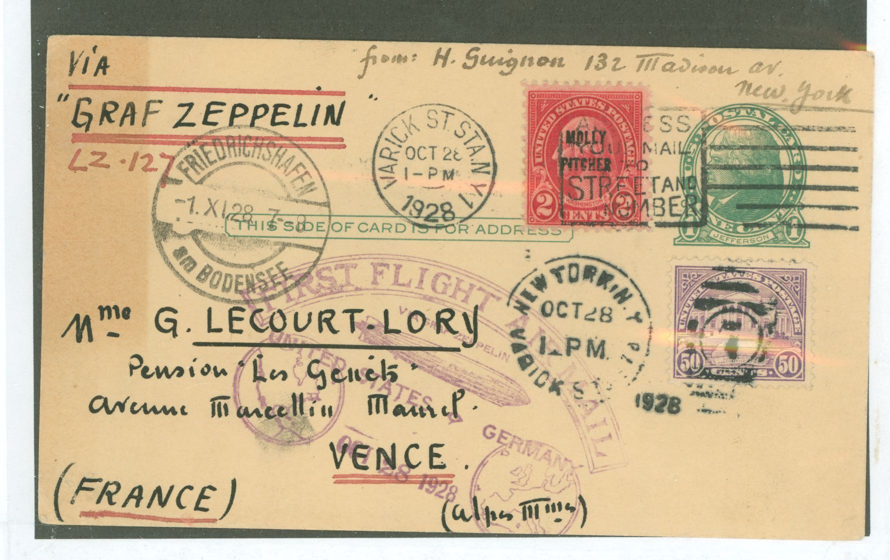 Oct. 28, 1928 Graf Zeppelin (LZ & 127) First Flight, Lakehurst to Fredrichshafen, Germany, Ultimately to Vence, France, with 53c postage APS Stamp Id: 501727746 APS Seller Id: 508479 Hinge Type: Not Specified