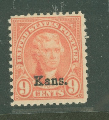 Kansas Overprint, appears genuine, short perfs left top APS Stamp Id: 501718153 APS Seller Id: 690190 Hinge Type: HR