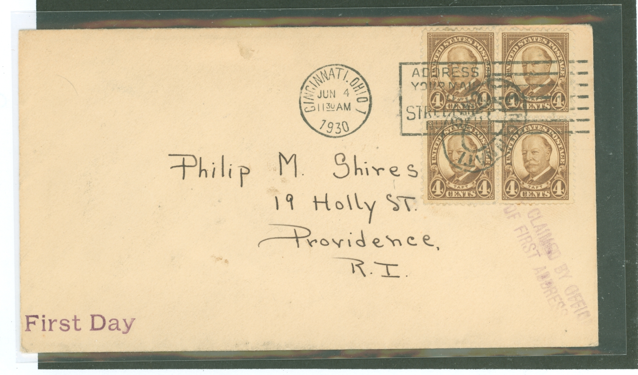 1930 4c William Taft (definitive) block of four on an uncacheted, addressed FDC with a Cincinnati machine First Day cancel APS Stamp Id: 501695816 APS Seller Id: 569655 Hinge Type: Not Specified