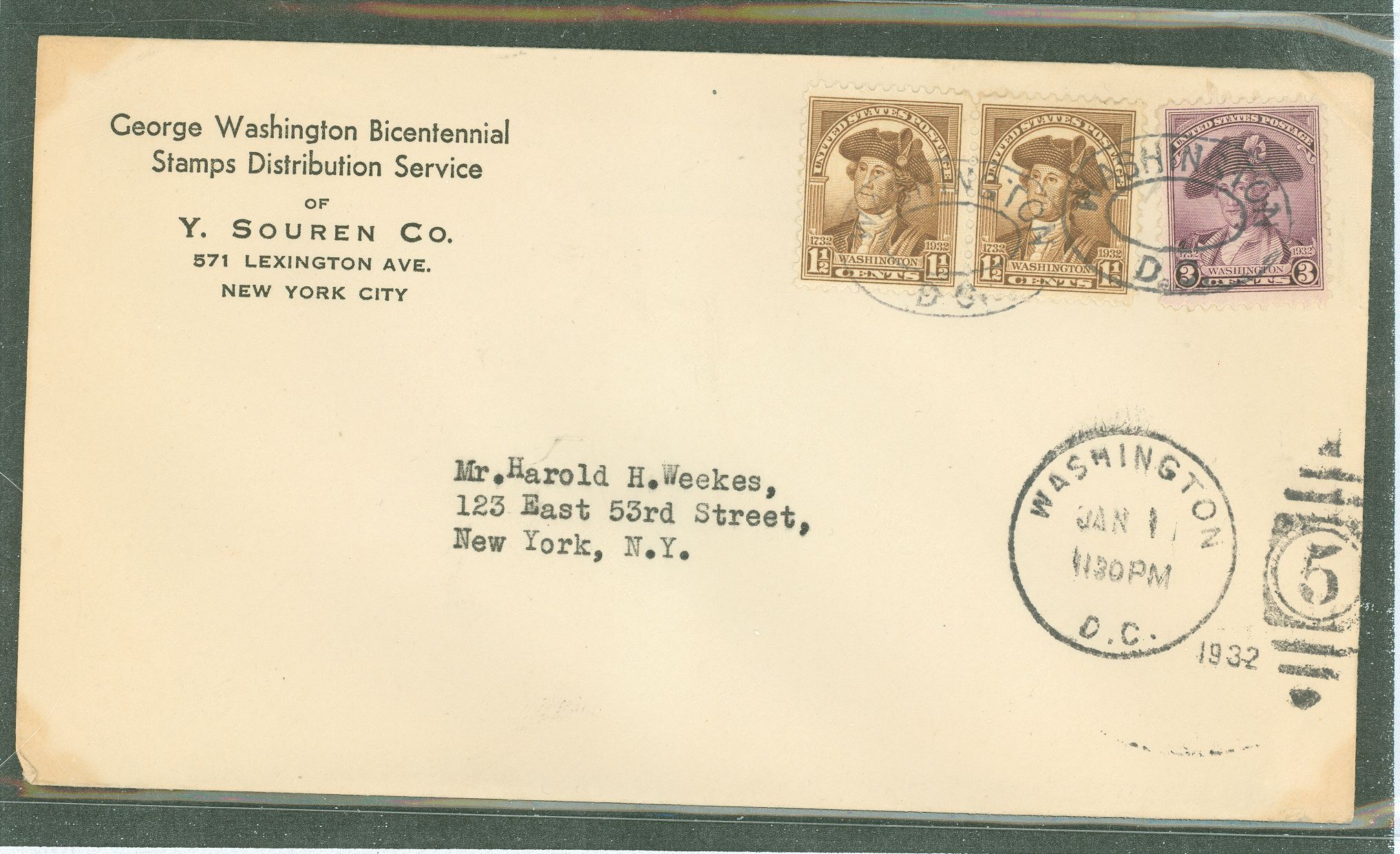 1932 1.5c (x2) + 3c values of the Washington bicentennial series on an addressed first day cover with a Washington, DC January 1 cancel. APS Stamp Id: 501725150 APS Seller Id: 569655 Hinge Type: Not Specified