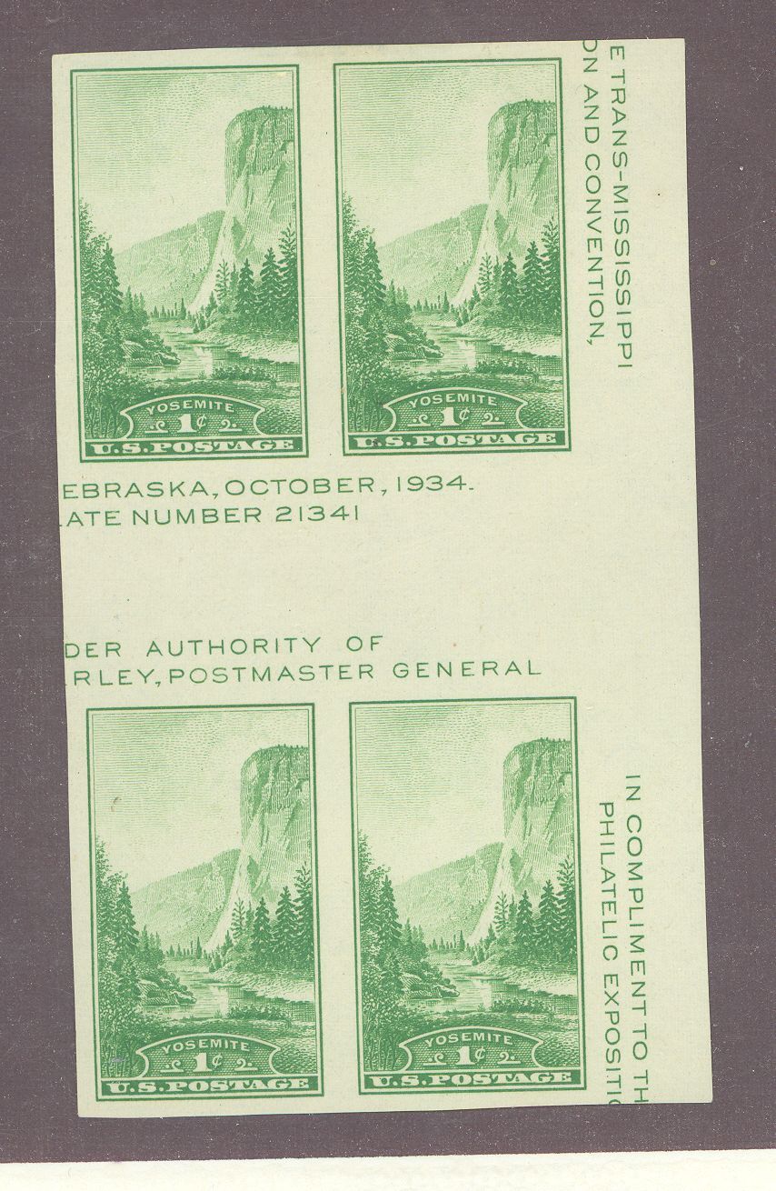 1935 Yosemite NP. Farley special printing issue s s block of 4 with horizontal gutter. APS Stamp Id: 501926459 APS Seller Id: 612224 Hinge Type: H Other Catalog Name: Brookman