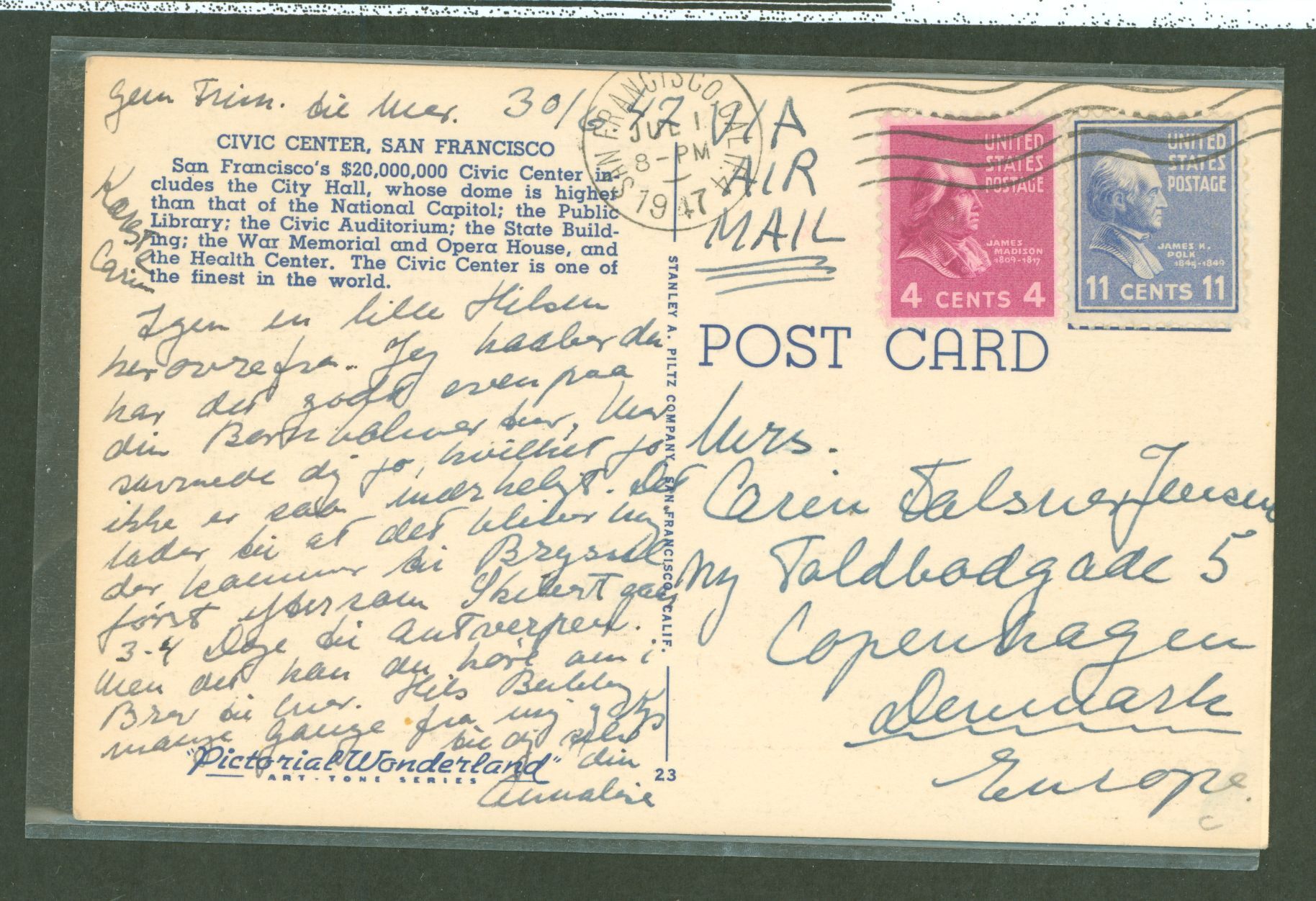 4c Prexy and a 11c prexy paid the 15c airmail half ounce rate to Europe (no allowance for postcards) on this July 1947 postcard sent from San Francisco to Copenhagen, Denmark.APS Stamp Id: 501750912