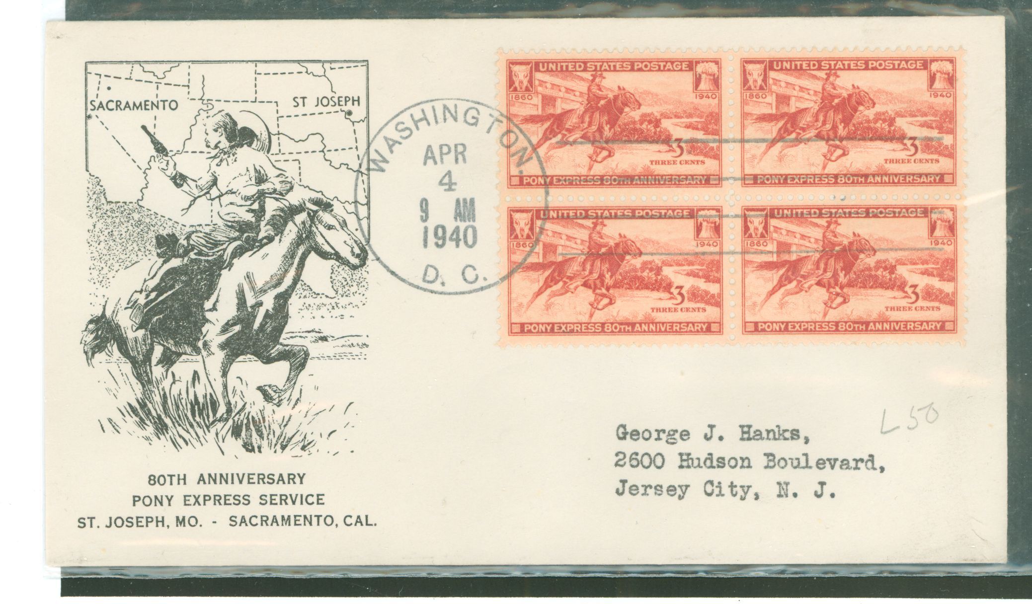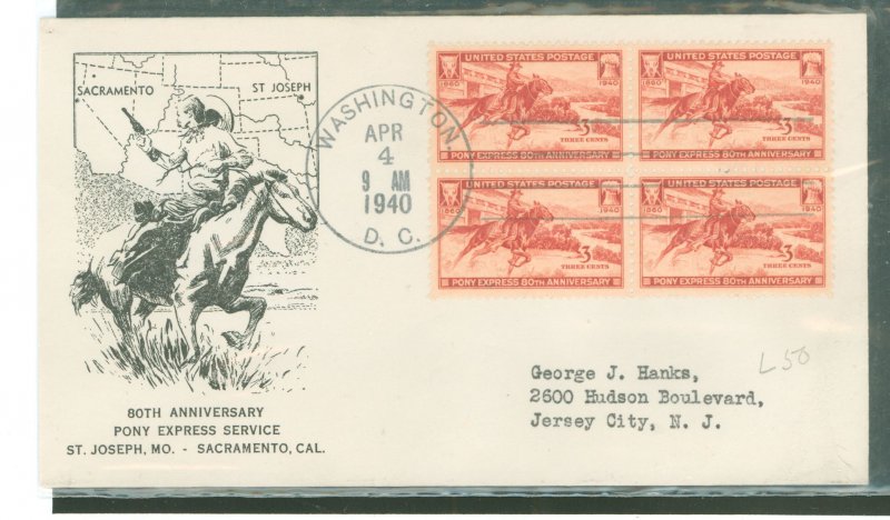 1940 Pony Express/80th anniversary (block of four) on an addressed 2nd day cover with a Washington, DC cachet and an unknown cachet. APS Stamp Id: 501878134 APS Seller Id: 569655 Hinge Type: Not Specified