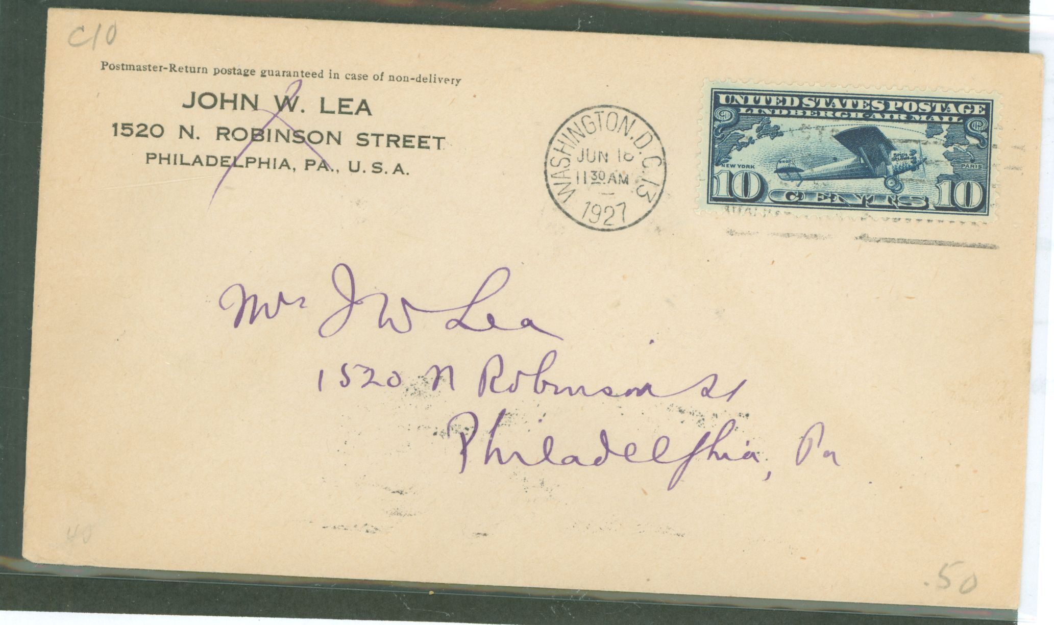 1927 10c Linbergh "Spirit of St. Louis" & maps on an addressed FDC with a Washington, DC cancelAPS Stamp Id: 501690105