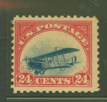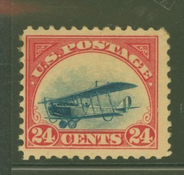 1918 Air post stamp 24c carmine and rose scarce landing plane variety full original gum, 3 toned perfs at left top, rich color APS Stamp Id: 502064806 APS Seller Id: 575340 Hinge Type: NH