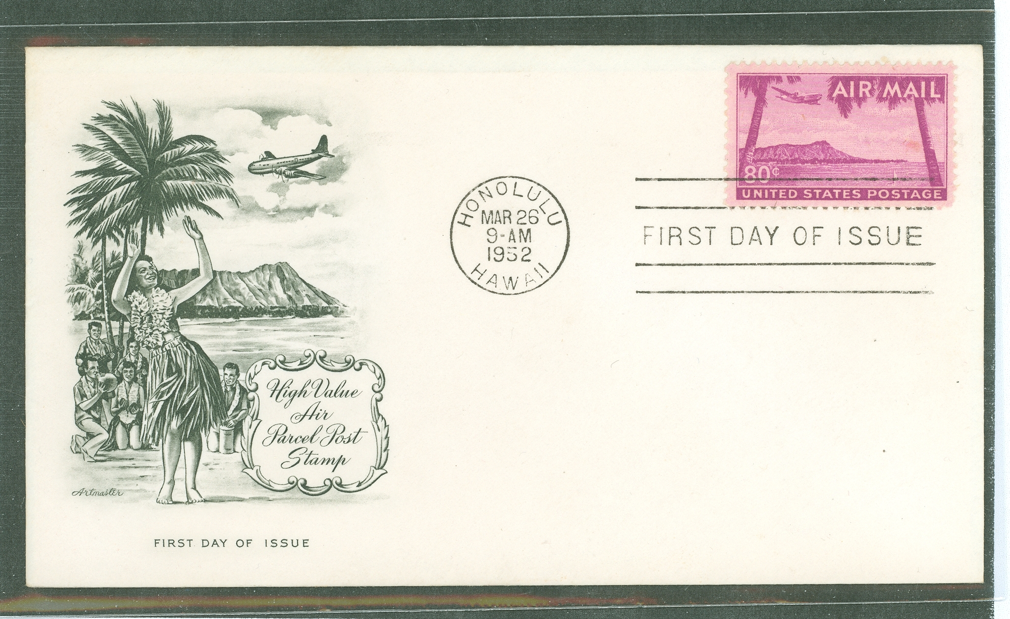1952 80c Honolulu-Diamond Head air mail stamp (single) on an unaddressed FDC with an Artmaster cachet APS Stamp Id: 501701362 APS Seller Id: 569655 Hinge Type: Not Specified