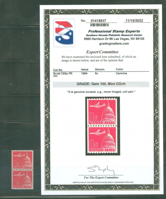 1964 8c Airmail coil pair graded Gem 100, mint OG NH APS Stamp Id: 501854463 APS Seller Id: 516833 Hinge Type: NH Other Catalog Name: SMQ
