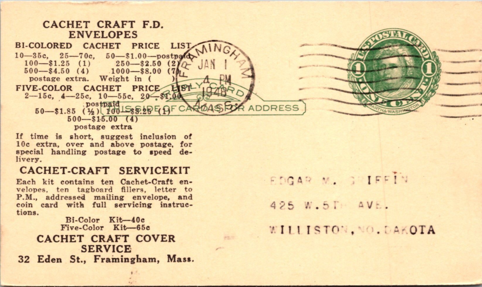 The best description of our covers is the provided scan. If there is something on the reverse that is important, we will show both sides. If you would like additional information about any cover, please send a request and we will try to answer. In exchange for low prices, we must limit the amount of information provided. That said, we try to put good quality covers on the site free of damage, but occasionally we miss something. The covers we sell will satisfy 98% of all collectors.Seller Information