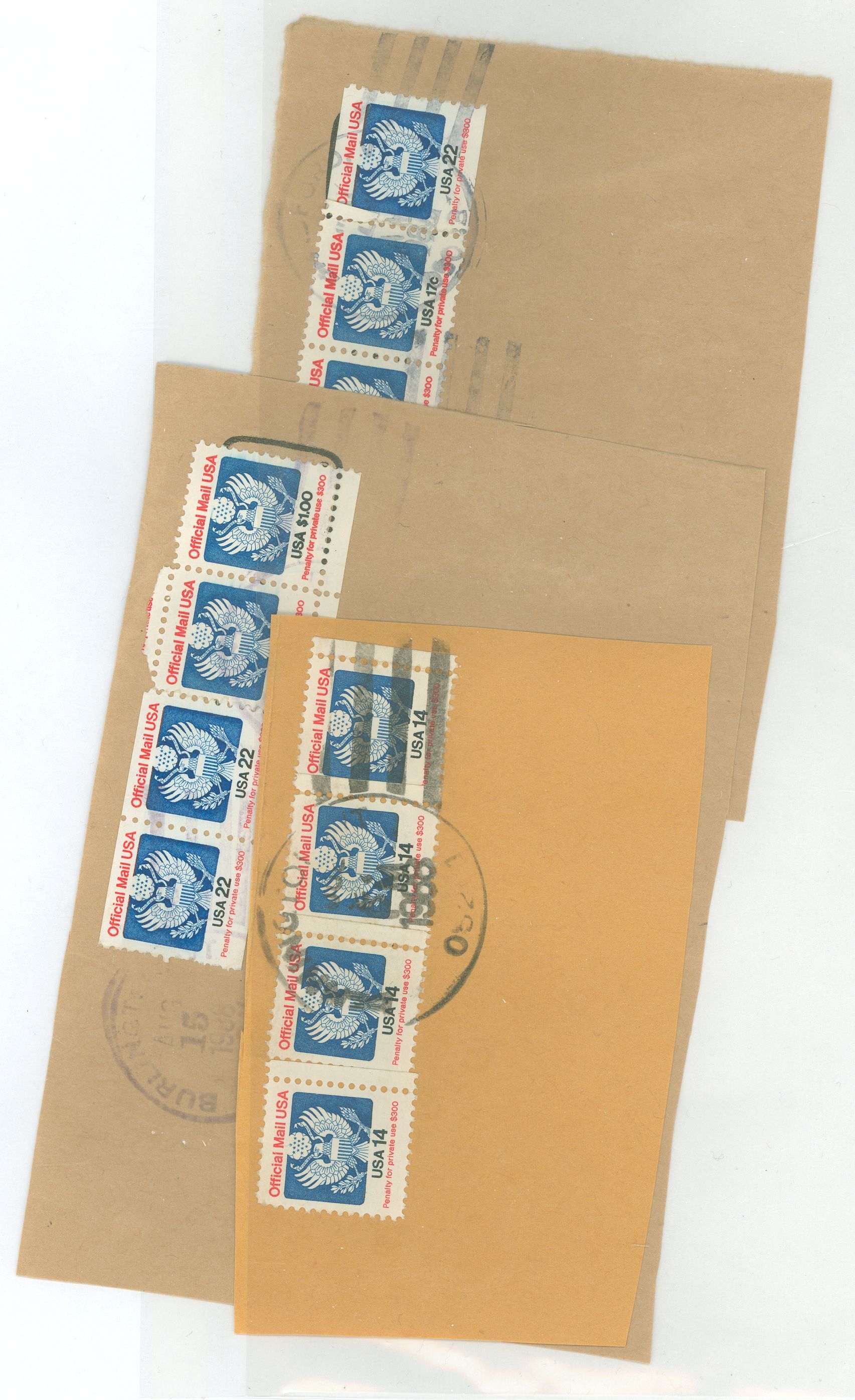 Official stamps on paper with Bradford and Burlington Vermont cancellations - O129A, O130, O132 and O136 APS Stamp Id: 501484237 APS Seller Id: 523044 Hinge Type: Not Specified