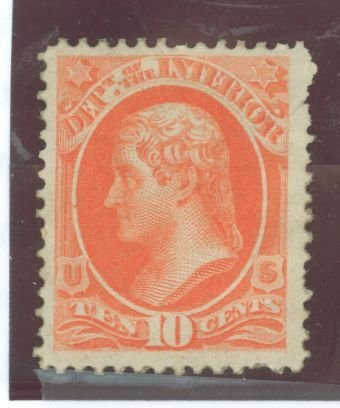 1873 Official-Interior Dept., perf 12, vermillion, disturbed gum, pulled perf on bottom APS Stamp Id: 501714772 APS Seller Id: 580678 Hinge Type: H