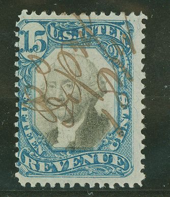 1871 15c George Washington Second Issue - Revenue. Blue & black. APS Stamp Id: 501498476 APS Seller Id: 508608 Hinge Type: Not Specified