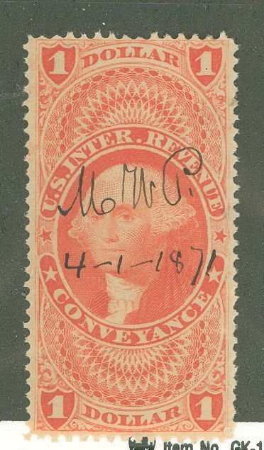 1862 $1 Conveyance Revenue single; nicely centered with a black "MWP 4-1-1871" April Fool's day pen cancel. APS Stamp Id: 501739696 APS Seller Id: 508479 Hinge Type: NG