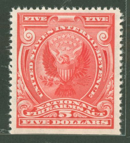 1960 $5 Eagle, shield, & stars, red-"Firearms transfer", XF-, NSE-Btm; rich color, sharp detail; beautiful & sound! Glossy gum (OGNH); SCV:85.00; hard to find! APS Stamp Id: 501893933 APS Seller Id: 738268 Hinge ... Read More