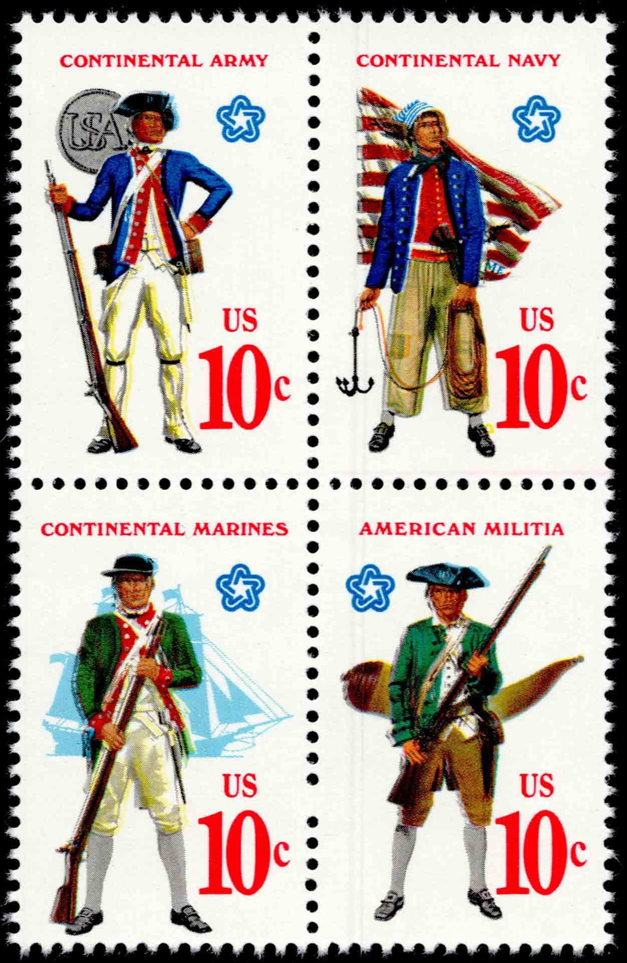 10c Continental Army, 10c Continental Navy, 10c Continental Marines and 10c American Soldier Se-tenant Block. Mint never hinged.