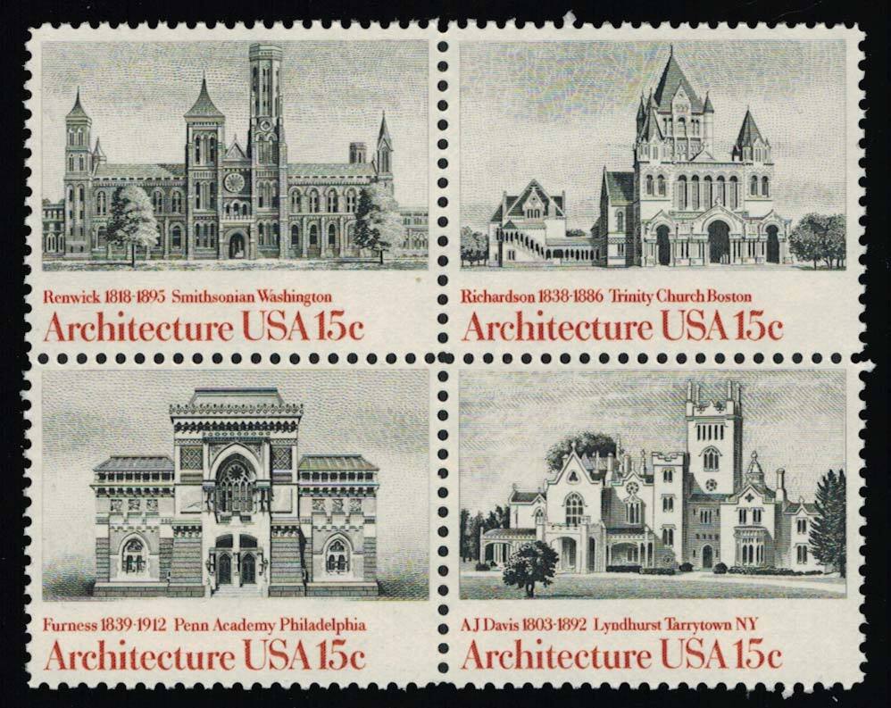 15c AJ Davis, 15c Furness, 15c Richardson and 15c Renwick American Architecture Se-tenant Block. Mint never hinged.