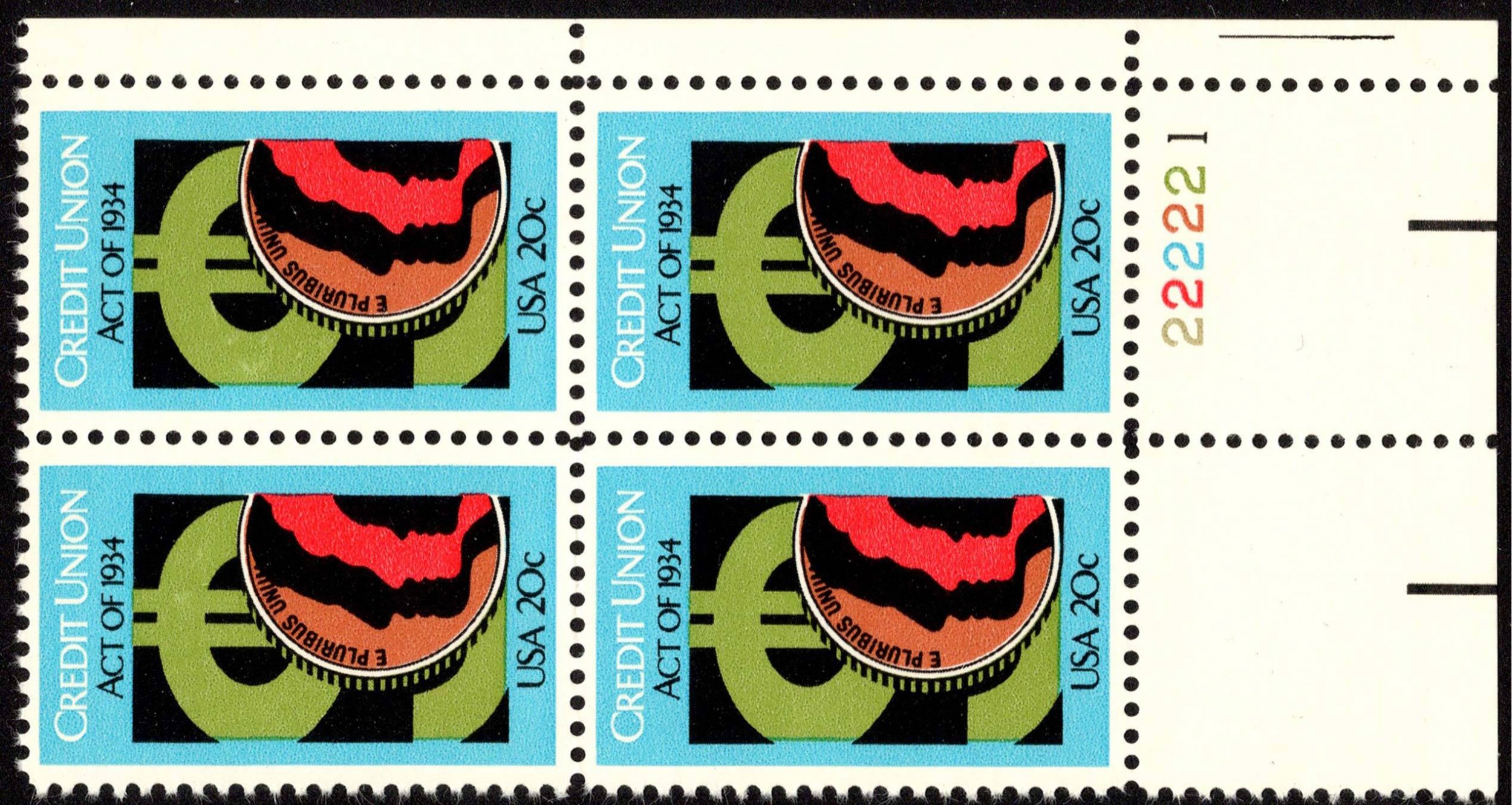 20c Credit Union Act Plate 222221 Block Lower Right. Mint never hinged.