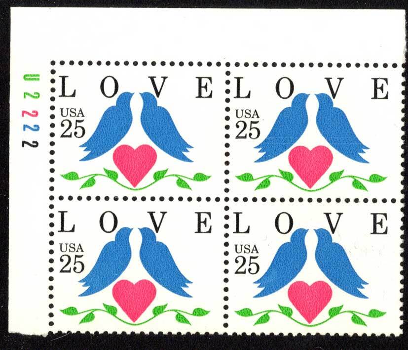 25c Love Plate U2222 Block Upper Left. Mint never hinged.Seller Information