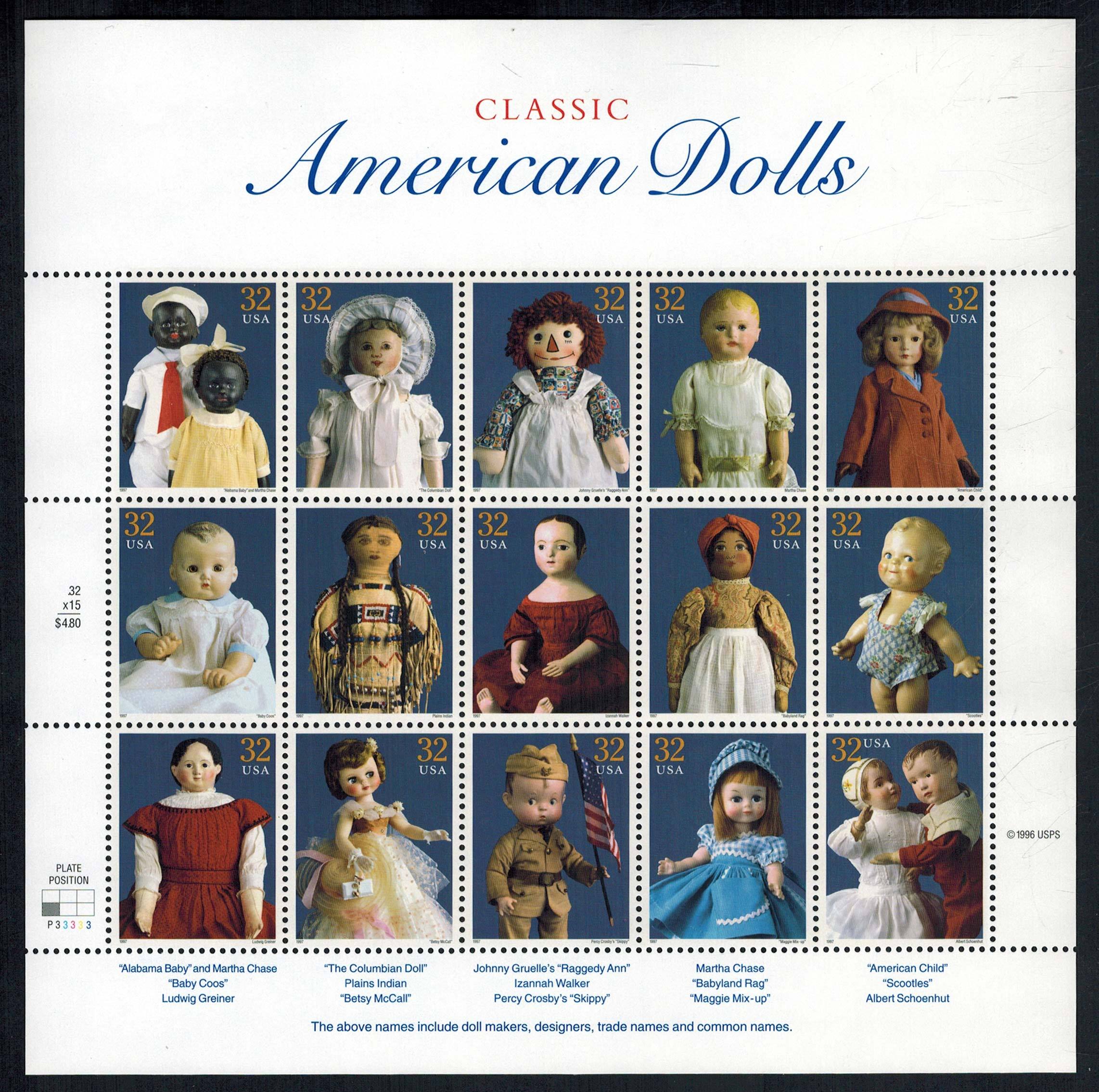 32c American Dolls Se-tenant pane of fifteen. Mint never hinged.