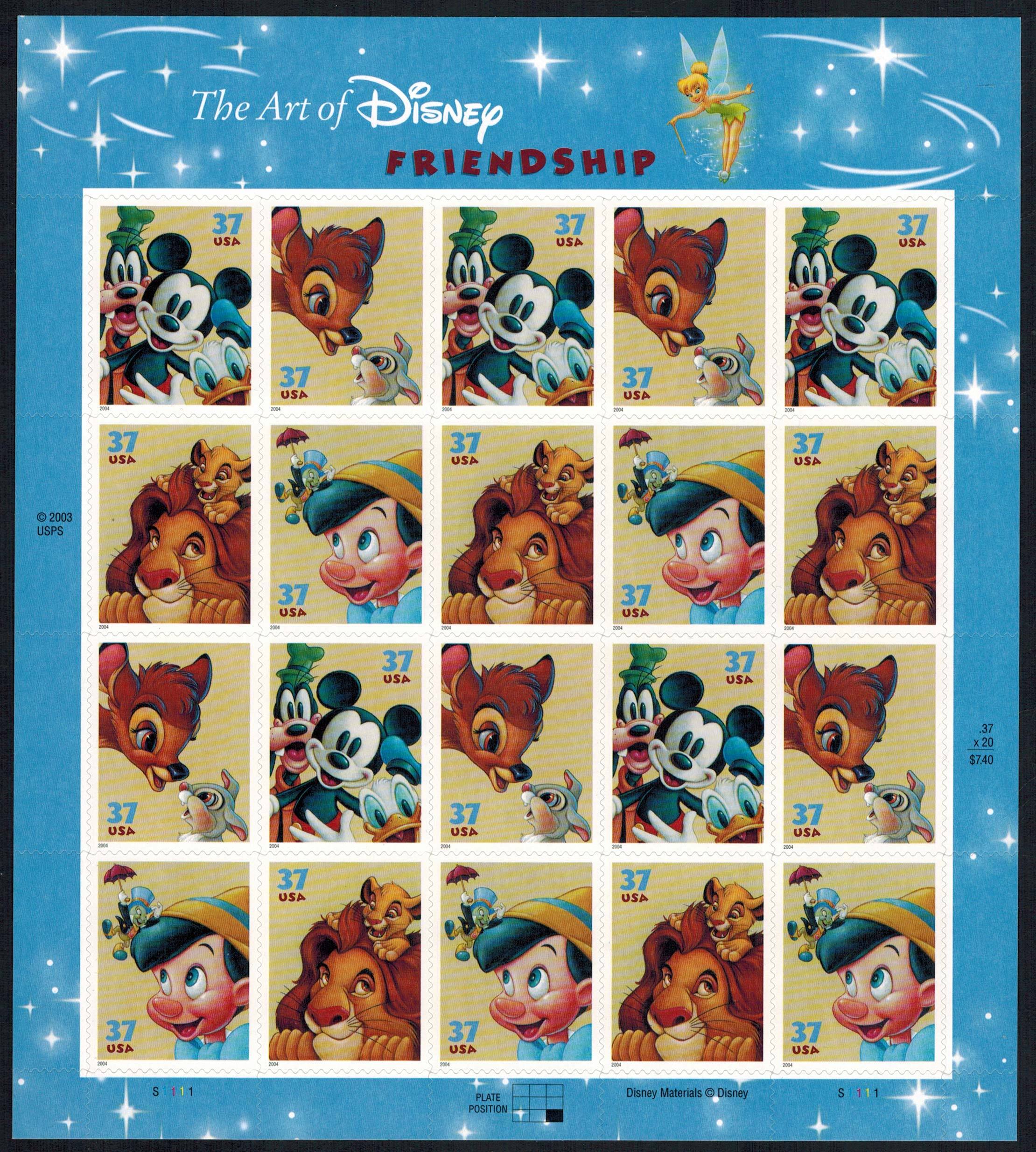 37c Lion King, 37c Mickey and Goofy, 37c Pinocchio and 37c Bambi Art of Disney Friendship Five Se-tenant Strips of four in pane of twenty. Mint never hinged.Seller Information