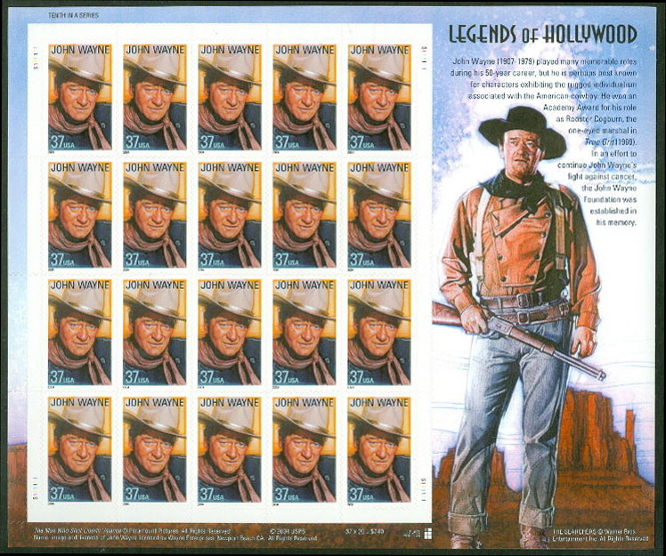 37c John Wayne Legends of Hollywood Complete Pane. Mint never hinged.