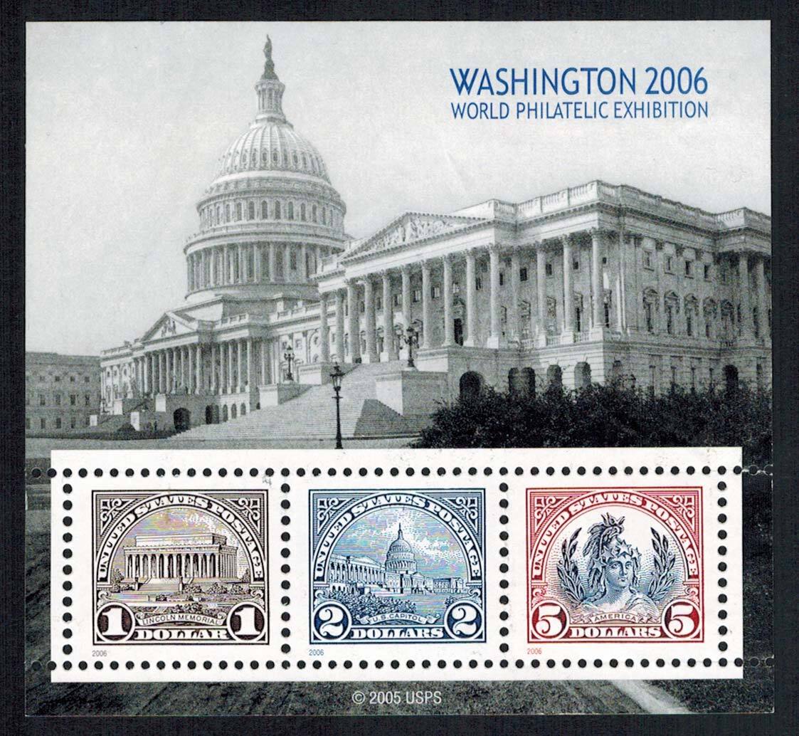 $1.00, $2.00 and $5.00 Washington World Philatelic Exhibition Souvenir Sheet. Mint never hinged.Seller Information