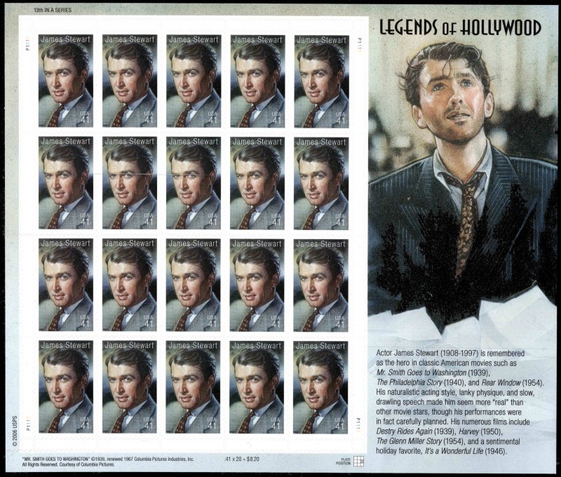 41c James Stewart Legends of Hollywood Pane of twenty. Mint never hinged.