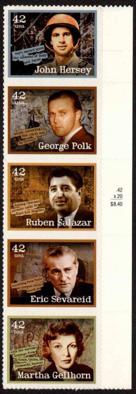 42c Gellhorn, 42c Hersey, 42c Polk, 42c Salazar and 42c Sevareid American Journalists Se-tenant Vertical Strip of five. Mint never hinged.