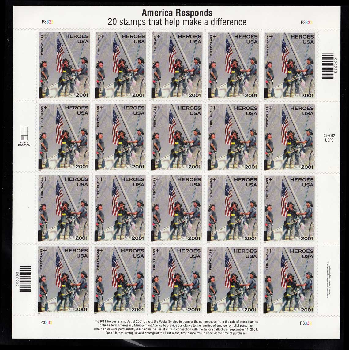 [34c+11c] Heroes Semi-Postal Complete Pane of twenty. Mint never hinged.Seller Information