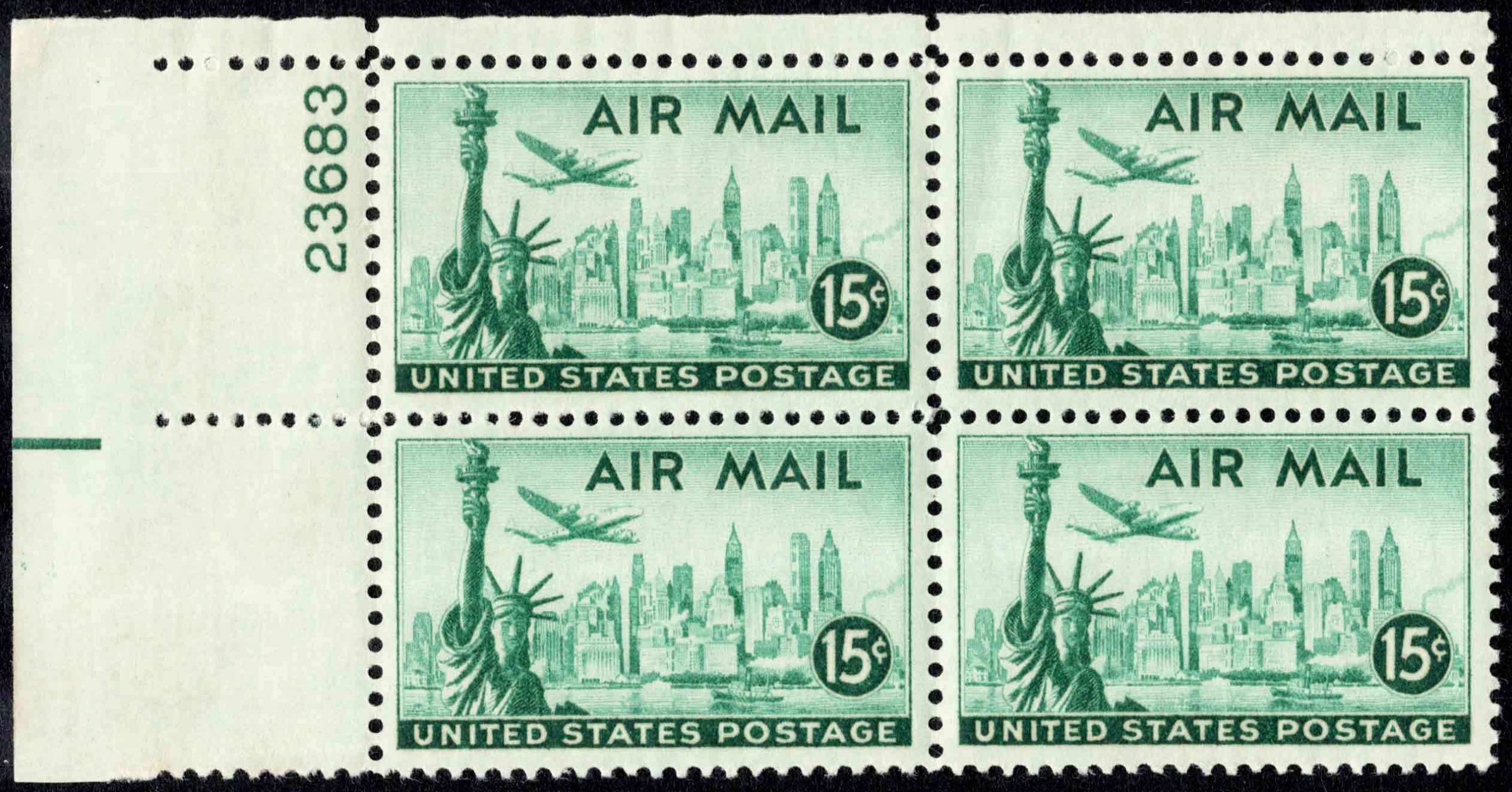 15c Plane Over Statue of Liberty Plate 23683 Block Upper Left. Mint never hinged.Seller Information