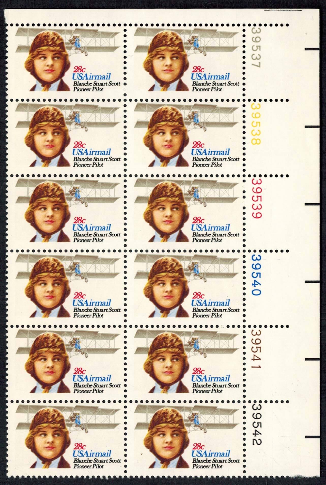 28c Blanche Scott Plate 39542 39541 39540 39539 39538 39537 Block of twelve. Mint never hinged.