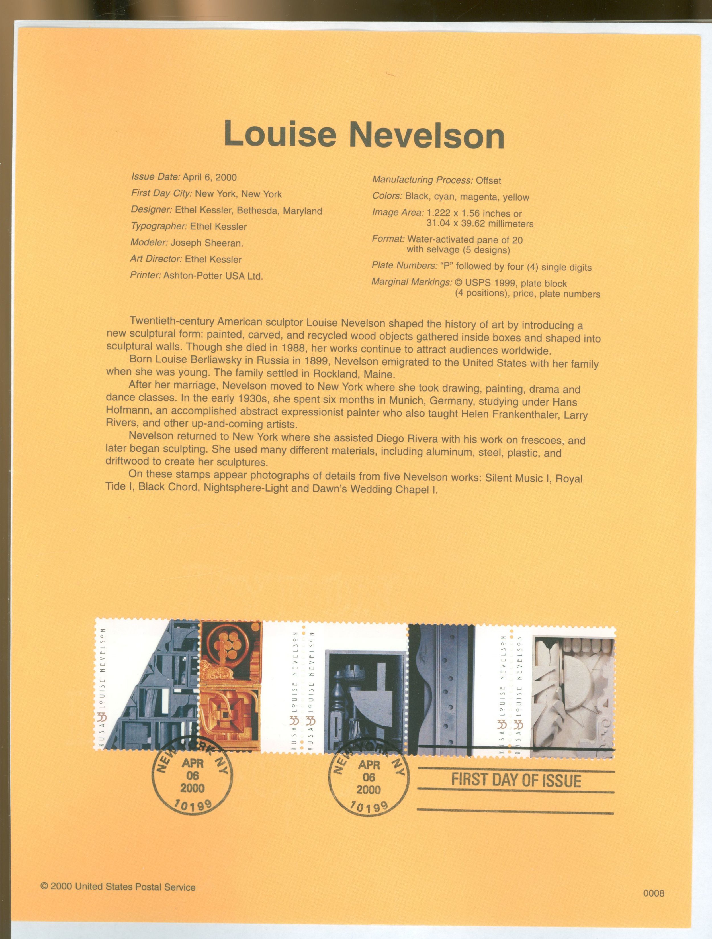 2001 Louise Nevelson,m sculptor - strip of five 33c stamps on an official USPS souvenir page/#3383a with a FD cancel APS Stamp Id: 501673204 APS Seller Id: 569655 Hinge Type: Not Specified
