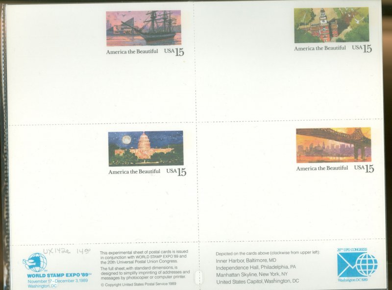 US UX142a 1989 sheetlet of 4 america the beautiful postal cards, issued for world stamp expo., unused
