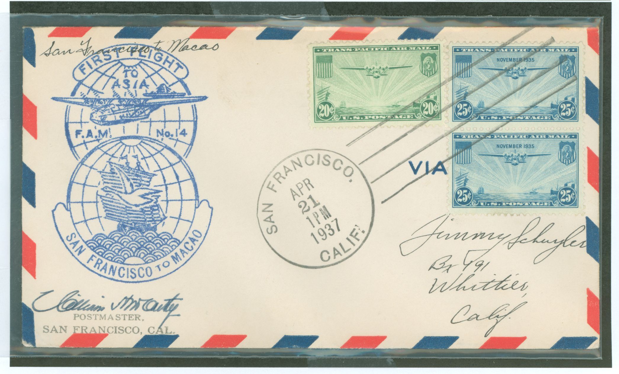 Aviation; 1937 China Clipper, San Francisco to Macao; Macao backstamp APS Stamp Id: 501736233 APS Seller Id: 595457 Hinge Type: Not Specified