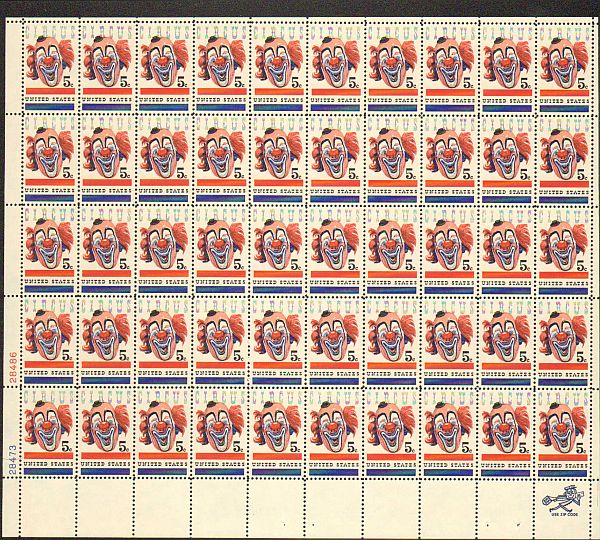 US #1309 Mint Sheet Circus Clown The image shown may not be the actual sheet you receive. Sheets will not be folded. Minor perf separations in the selvedge are normal and are not grounds for return. Centering will ... Read More