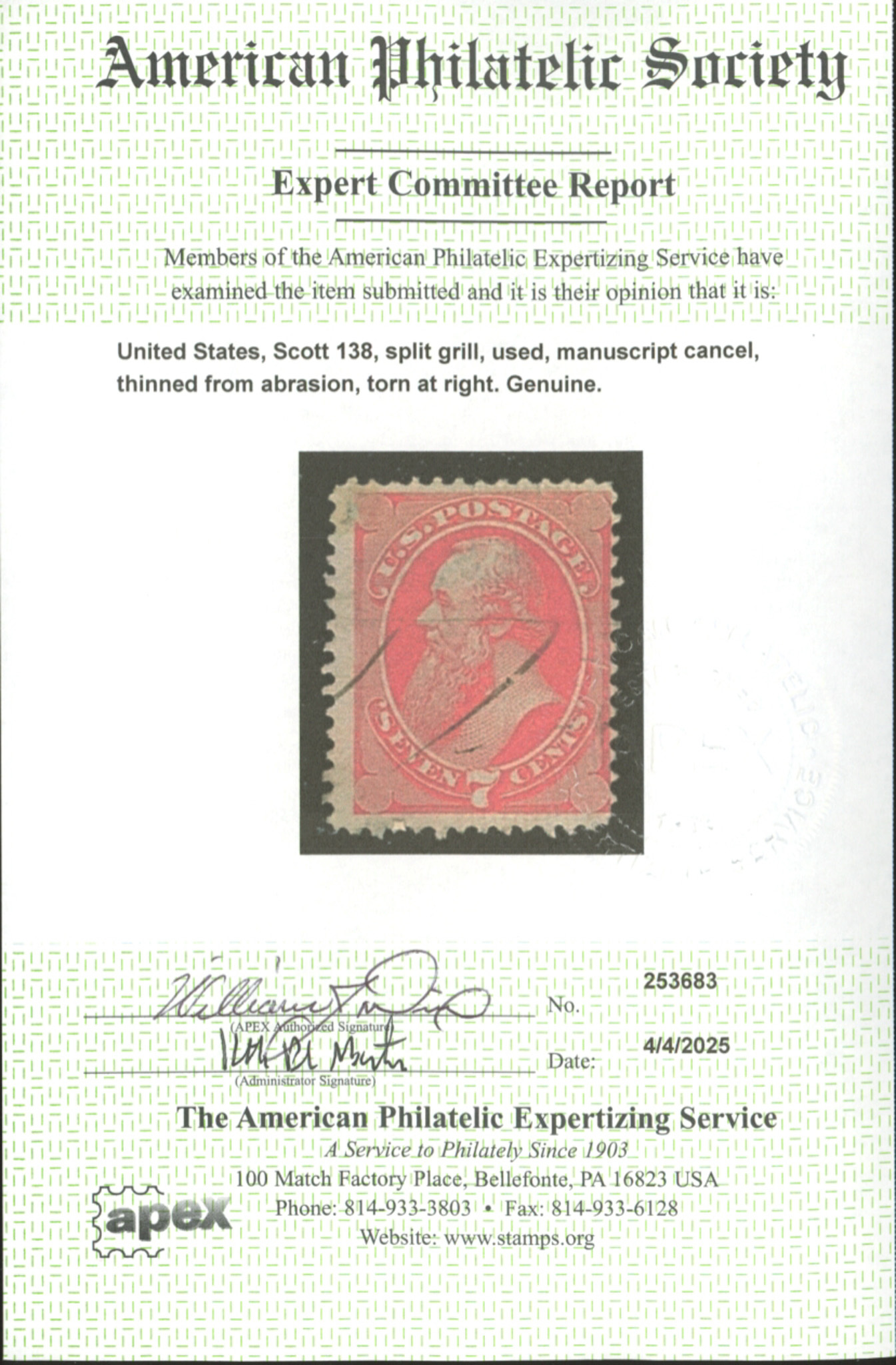 U.S. #138 USED WITH APS CERT SPLIT GRILLSeller Information