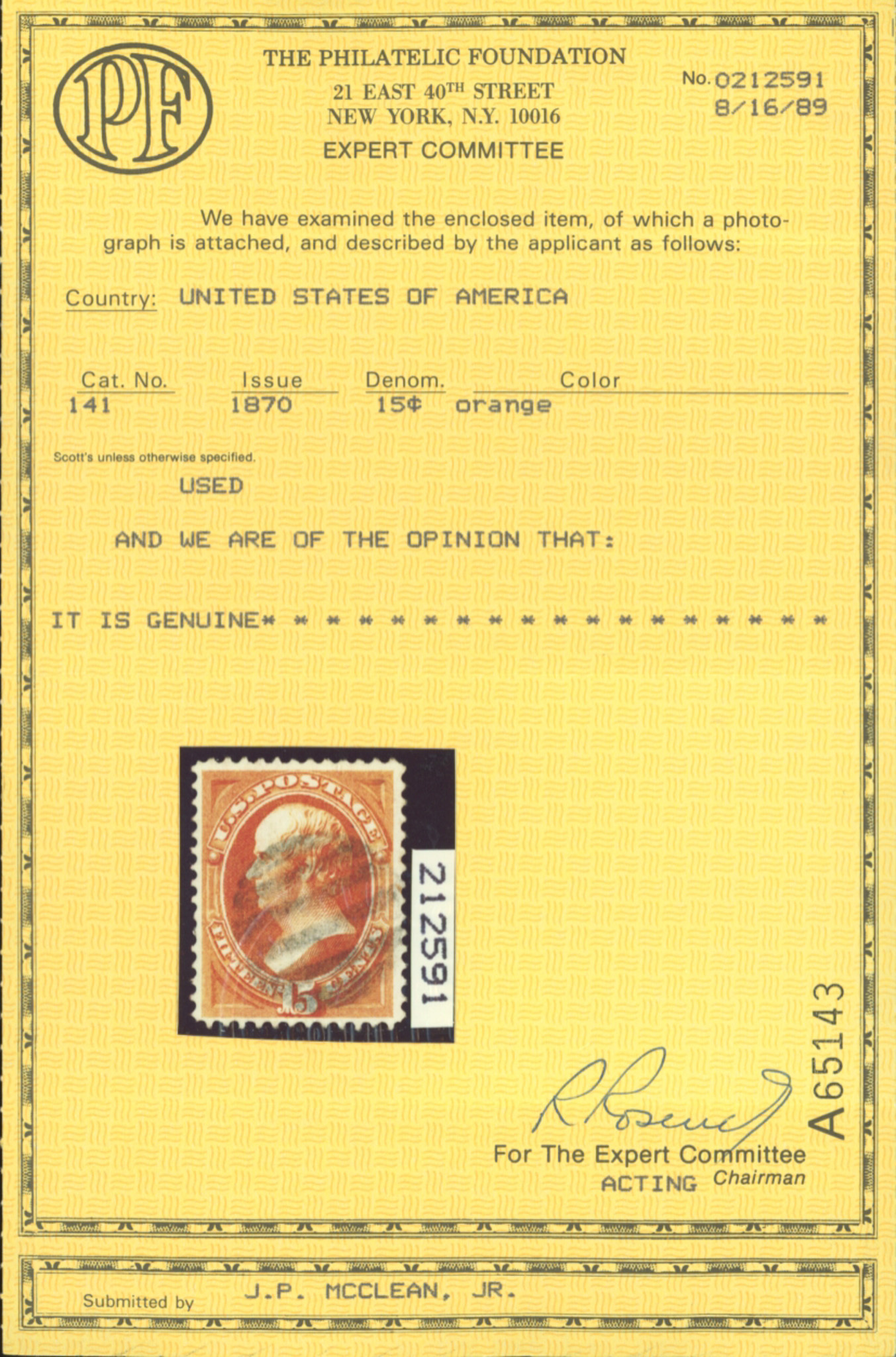 U.S. #141 USED WITH PF CERT