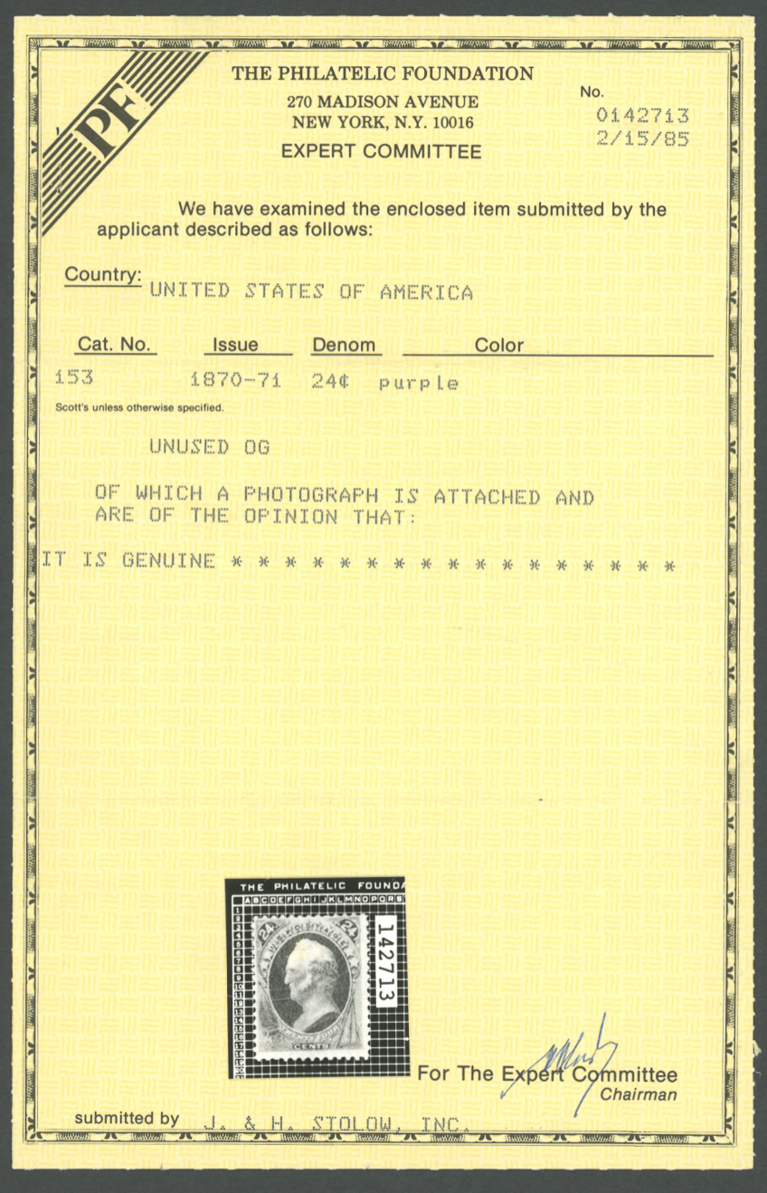 U.S. #153 MINT WITH PF CERTSeller Information