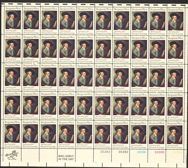 US #1553 Mint Sheet Benjamin West The image shown may not be the actual sheet you receive. Sheets will not be folded. Minor perf separations in the selvedge are normal and are not grounds for return. Centering wil ... Read More