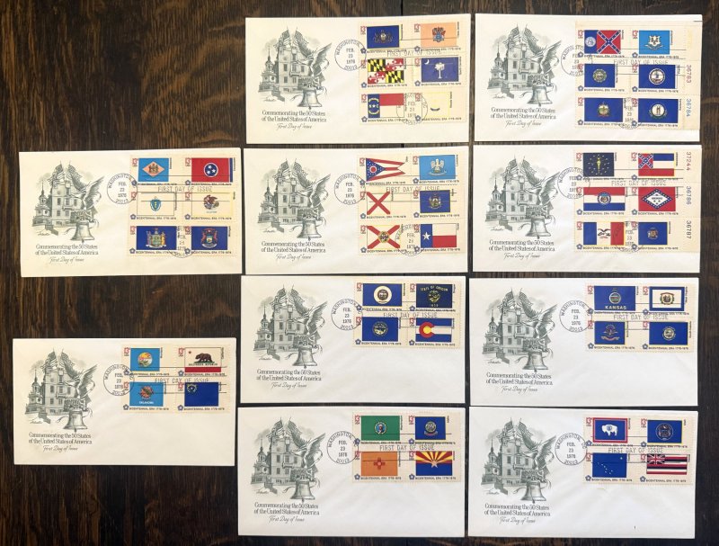 Scott 1633-1682 American Bicentennial flags issue on a combination of plate blocks, blocks and pairs, (the two covers on the left of the first picture are actually vertical strips, placed close together to look like blocks) set of ten Artmaster cachet, FDC, format = multiple, flaps are open and covers are un-addressed.Member AFDCS / APS and longtime seller of quality covers on multiple auction sites.