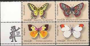 US #1712-15 Zip Code Block - Butterflies. Dogface, Swallowtail, Orange-Tip, Chec