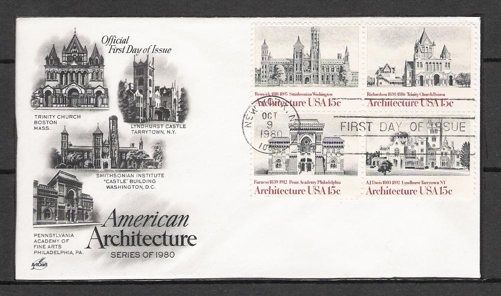Welcome! United States - First Day Cover Catalogue #: 1841a Cachet: Art Craft Date: October 9, 1980 City/State: New York, NY Description: 15c American Architecture - Block of 4 Condition: VG - Cle ... Read More