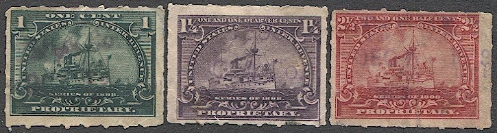US 1898 1c, 1 1/4c, 2 1/2c Battleship Proprietary Revenues, Sc RB24-25,28 Used