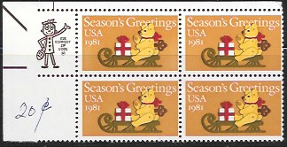 US #1940 MNH Zip Code Block. Bear on Sled - Christmas