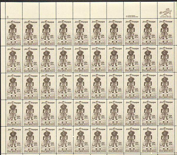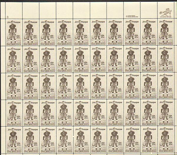 US #2089 Mint Sheet Jim Thorpe The image shown may not be the actual sheet you receive. Sheets will not be folded. Minor perf separations in the selvedge are normal and are not grounds for return. Centering will b ... Read More